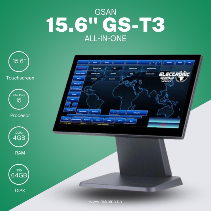 15.6" ekran osjetljiv na dodir, Intel Core i5 procesor, 4GB RAM-a, 64GB SSD, rezolucija: 1024 x 768, VFD displej za kupce - 2 linije sa 40 znakova, kompatibian sa OS: Windows 10, Windows 7, POS System.